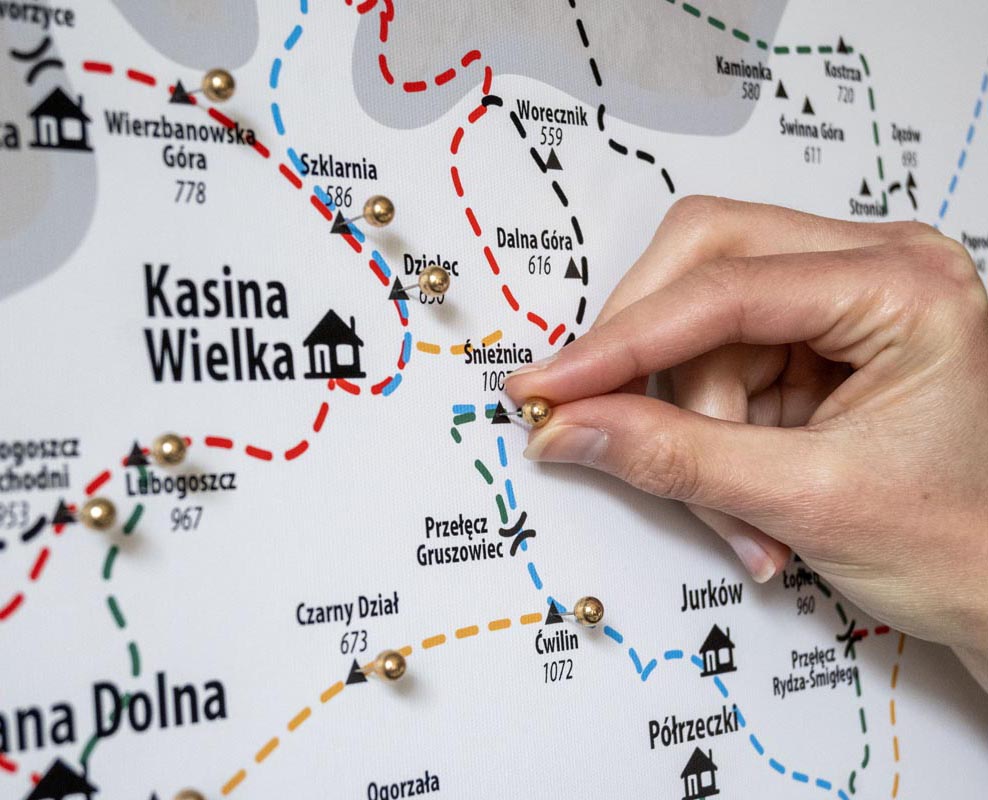 Zaznaczaj zdobyte szczyty lub przypinaj zdjęcia. Mapa jest gotowa do powieszenia na ścianie, w komplecie 100 pinezek w wybranym kolorze.
