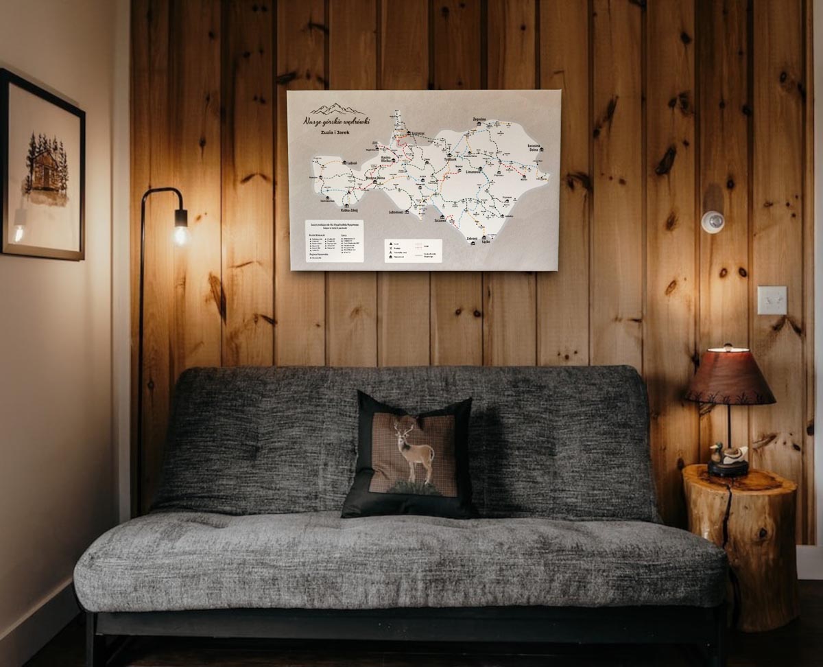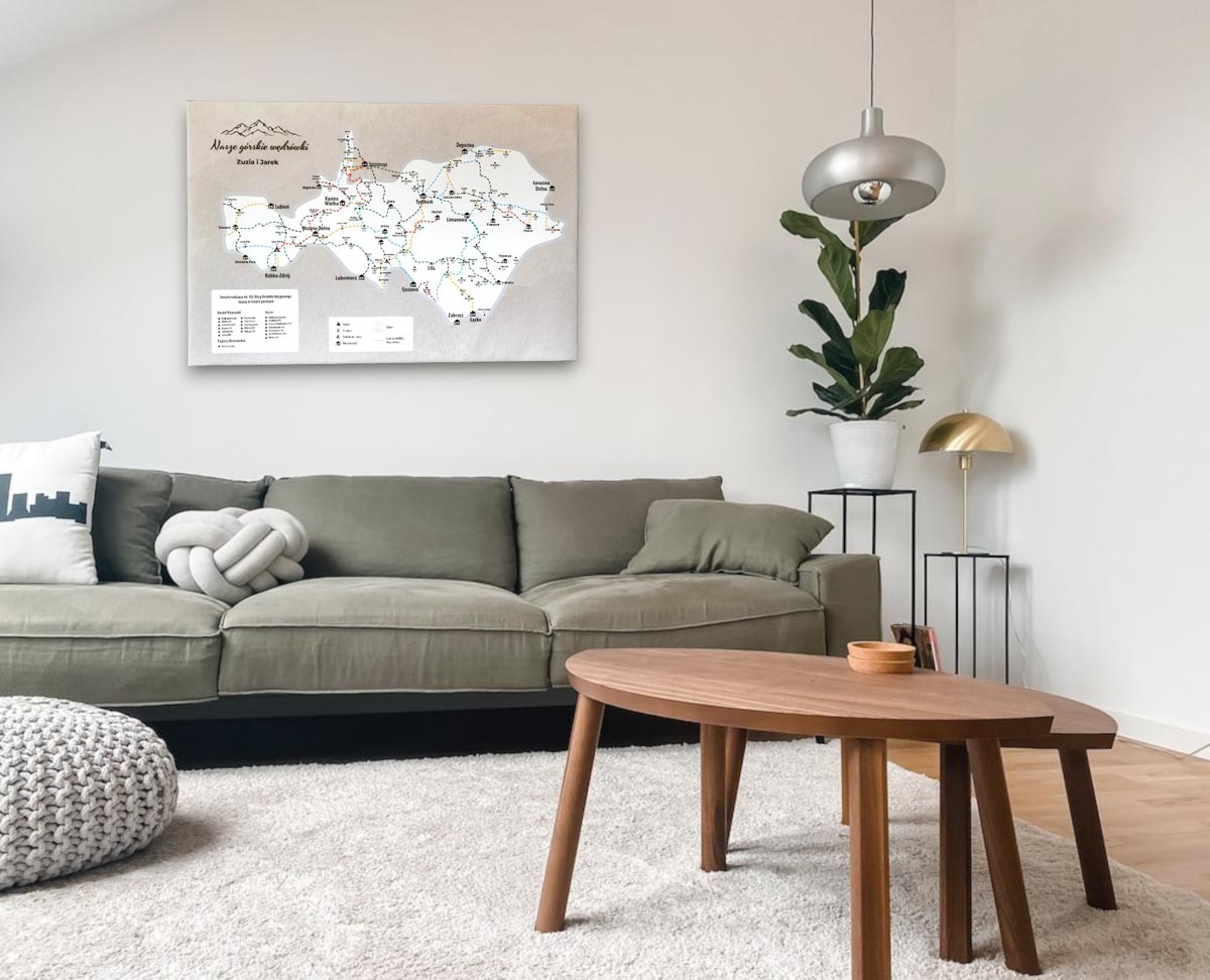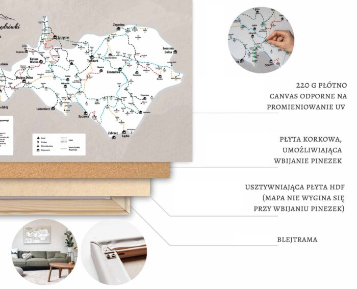 Mapa Beskidu Wyspowego na ścianę do zaznaczania we wzorze szarym wydrukowana jest na wysokiej jakości płótnie canvas. Pod płótnem umieszczona jest 4mm płyta korkowa z prawdziwego korka, dzięki której oznaczysz pinezkami zdobyte szczyty, przełęcze, schroniska i jaskinie lub przypniesz do mapy zdjęcia z beskidzkich wędrówek.