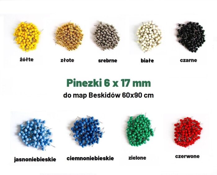 Do zestawu dołączamy komplet 100 okrągłych pinezek (pinezki w rozmiarze 4 x 15 mm do mapy 40 x 60 cm lub pinezki 6 x 17 mm do mapy 60 x 90 cm).